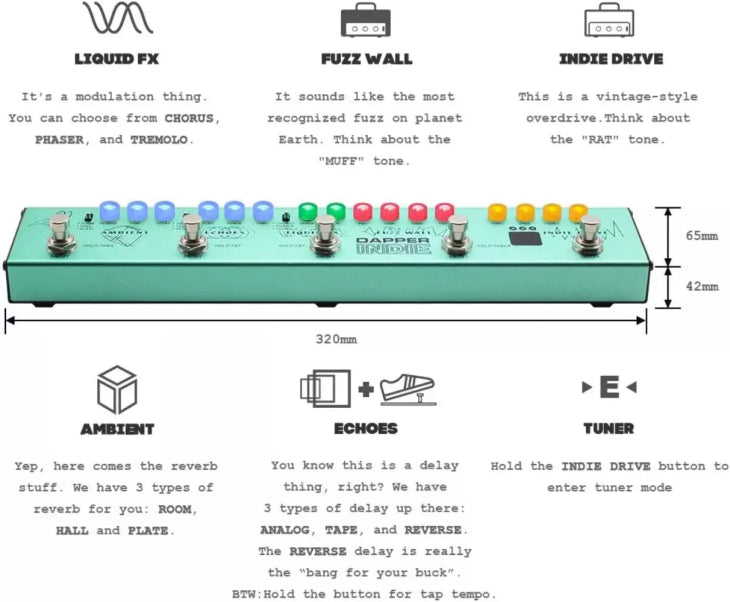 Indie Drive, Fuzz Wall, Liquid FX, Echoes, Ambient and more (with 9V power supply) one pedal has everything you need, plus some inspirations.